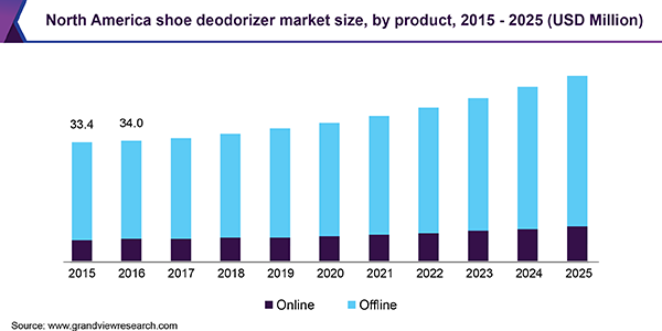 The global shoe deodorizer market size is expected to reach USD 153.2 million by 2025, according to a new report by Grand View Research, Inc., registering a CAGR of 6.0% over the forecast period. Factors such as an increased inclination toward foot health and shoe hygiene as well as the growth of the footwear industry drive the demand for deodorizers.