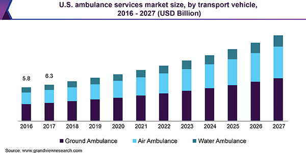 The global ambulance services market size is expected to reach USD 50.0 billion by 2027, expanding at a CAGR of 9.3%, according to a new report by Grand View Research, Inc. Favorable reimbursement policies and rising medical tourisms are anticipated to fuel the demand for ambulance services over the forecast period.