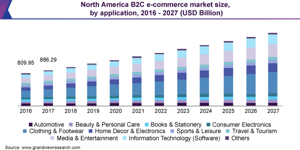 The global B2C e-commerce market size is anticipated to reach USD 6.2 trillion by 2027, registering a CAGR of 7.9% over the forecast period, according to a new report by Grand View Research, Inc. The increasing disposable income level, escalating usage of internet and smartphones, and an increasing number of online shoppers are expected to drive the market growth. Online goods and service providers offer various options to its customers, such as vast product portfolio, discounted price rates, convenient payment methods, same-day delivery, and easy return policies while purchasing any goods or services, resulting into growing customer preference toward e-commerce platforms.