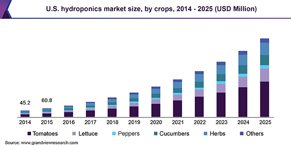 The global hydroponics market size is estimated to reach USD 5.68 billion by 2025, exhibiting a CAGR of 22.52% from 2019 to 2025, according to the new study conducted by Grand View Research, Inc. The adoption of smart farming technologies, such as vertical farming, which has helped the evolution of hydroponics, is expected to spur the market growth. Continuous improvements in hydroponics technologies and the introduction of innovative, state-of-the-art technologies, including environmental and temperature sensing, remote growth monitoring, and automatic nutrient reading, is likely to fuel the demand.