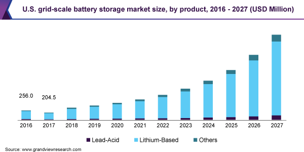 In the U.S., increasing demand for lithium-ion batteries as an essential battery storage product can be attributed to their highly improved efficiency, energy density, and deep discharge cycle. In addition, a rapid cost decrease owing to growing storage demand and increased deployment demand for a renewable source of energy integration is projected to drive the market over the forecast period.