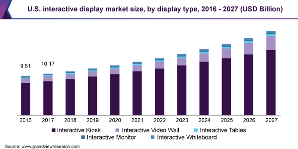 Furthermore, strong growth in the market is attributed to increasing penetration of technologies such as interactive monitor and whiteboard, specifically in North America, which accounted for the largest revenue share in the overall market in 2019. Besides, the entertainment sector is witnessing a paradigm shift in the various approaches of advertisement display. Furthermore, interactive video walls and kiosks are used by companies as a medium of promotion to attract larger crowd.