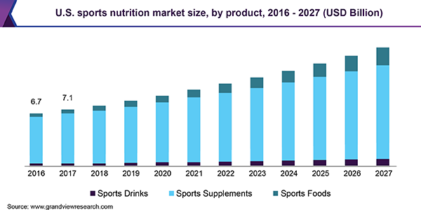 The global sports nutrition market size was valued at USD 15.6 billion in 2019 and is expected to grow at a compound annual growth rate (CAGR) of 8.9% from 2020 to 2027. Increase in demand for various types of protein bars, dietary supplements, and energy drinks among athletes and bodybuilders is one of the major factors driving the market growth. Rising disposable income, rapid urbanization, and increase in the number of gyms and health and fitness centers endorsing sports and fitness nutrition products also positively influence market growth.