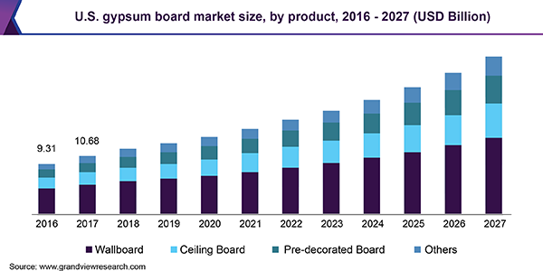 - The U.S. gypsum board market is expected to realize gains at a CAGR of 10.6% from 2020 to 2027 due to presence of a well-established construction industry and acceptance of enhancing construction materials