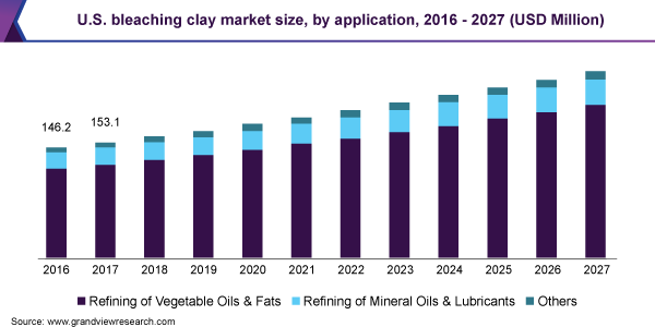 The global bleaching clay market size is expected to reach USD 1.9 billion by 2027 registering a CAGR of 5.5%, according to a new report by Grand View Research, Inc. Growing consumption of refined vegetable oils is one of the major factors driving the market. Bleaching clay is used to remove impurities in vegetable oils and achieve high quality and pure oils. The primary source of raw materials include bentonite, sepiolite, and attapulgite.