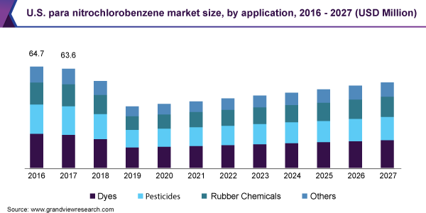 The global para nitrochlorobenzene market size is projected to reach USD 420.7 million by 2027, according to a new report by Grand View Research, Inc., expanding at a CAGR of 4.1% over the forecast period. Dyes emerged as the most dominant application of para nitrochlorobenzene (PNCB) in 2019 in terms of revenue on account of growing textile market, especially in the developing countries of Asia Pacific.