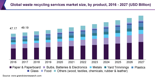 The global waste recycling services market size is projected to reach USD 80.30 billion by 2027, according to a new report by Grand View Research, Inc., expanding at a CAGR of 5.2% from 2020 to 2027. Rising awareness regarding proper disposal of waste to safeguard the environment and human health has resulted in the emergence of various disposal methods and techniques.
