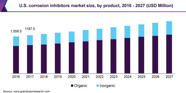 The global corrosion inhibitors market size is anticipated to reach USD 9.9 billion by 2027, expanding at a CAGR of 3.8%, according to a new report by Grand View Research, Inc. The growth in the market can be attributed to increasing investments in oil and gas extraction and production activities in the developing economies across the globe.