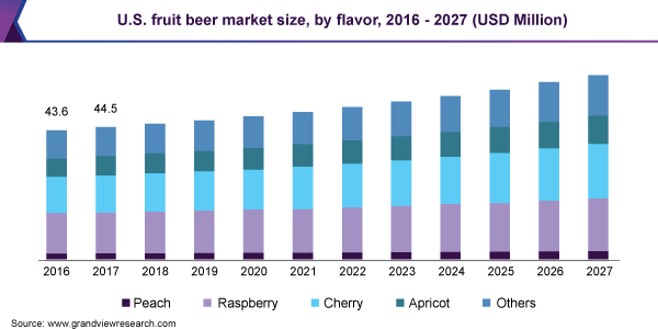 The global fruit beer market size is expected to reach USD 379.5 million by 2027, exhibiting a CAGR of 4.5% over the forecast period, according to a new report by Grand View Research, Inc. Growing popularity of alcohol free beer among millennials as an occasional drink during after-office hours and weekends is expected to remain a favorable factor for the industry growth over the next few years.