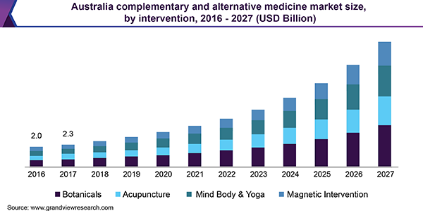 The global complementary and alternative medicine market size is projected to reach USD 296.3 billion by 2027, exhibiting a CAGR of 19.9%, according to a new report by Grand View Research, Inc. A comparatively high demand for alternative medicine across developing countries and expanding applications of traditional medicine practiced in Asia are two key driving factors of the market. China and India are the key contributors to the Asia Pacific region and thus are offering significant momentum to the revenue generation by complementary and alternative treatment through the study period.