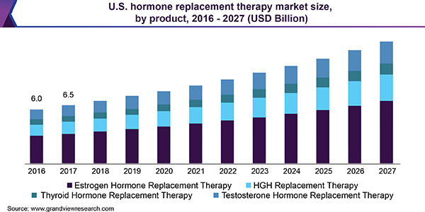 The global hormone replacement therapy market size is expected to reach USD 39.6 billion by 2027, expanding at a CAGR of 7.7%, according to a new report by Grand View Research, Inc. A significant rise in the incidence rate of hormonal disorders in the newborns, adults, and elderly and populations is driving the market. The Prader-Willi syndrome (PWS) affects one in every 15,000 newborns, thereby boosting the demand for the therapy.