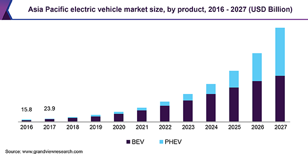 The global electric vehicle market demand is expected to reach $1,212.1 billion by 2027, expanding at a CAGR of 38.1% over the forecast period, according to a study conducted by Grand View Research, Inc. The market is driven by initiatives taken by governments of various countries to promote manufacturing of Electric Vehicles (EVs). For instance, the Electric Vehicles Initiative (EVI), a multi-government forum, aims at increasing the adoption of EVs globally. As of now, there are thirteen countries participating in this forum, namely Canada, Chile, U.K., Germany, Sweden, Netherlands, Norway, Finland, France, China, Japan, India, and New Zealand. Several campaigns and programs have been launched under this forum such as the EV30@30 in 2017, which sets a target for 11 countries to have at least 30.0% sales of new EVs by 2030.