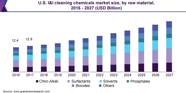 The global industrial and institutional cleaning chemicals market size is anticipated to reach USD 88.1 billion by 2027, expanding at a CAGR of 7.5%, according to a new report by Grand View Research, Inc. Growing consumer awareness regarding hygiene maintenance along with stringent government regulations pertaining to cleaning operations in industrial sector is expected to drive the market over the forecast period.