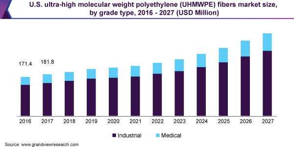 The global ultra-high molecular weight polyethylene fibers market size is expected to reach USD 1.41 billion by 2027, expanding at a CAGR of 8.6% from 2020 to 2027, according to a new report by Grand View Research, Inc. Rising demand from various applications, such as protective armor, medical devices, nets, wear and gear, ropes, and sports equipment is a key factor driving the market. Growing geriatric population, majorly in North America and Europe, is presumed to play a critical role in shaping the demand for ultra-high molecular weight polyethylene (UHMWPE) fibers in the medical devices application segment over the forecast period.