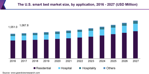 The global smart bed market size is anticipated to reach USD 3.1 billion by 2027, expanding at a CAGR of 4.5%, according to a new report by Grand View Research, Inc. Rising prominence for gaining a healthy sleep through the infusion of sensor-based advanced technology is the growing demand for smart beds. In addition, rising penetration of smart homes across regions is also paving way for technologically integrated household products, thereby paving the way for increased growth of the market.
