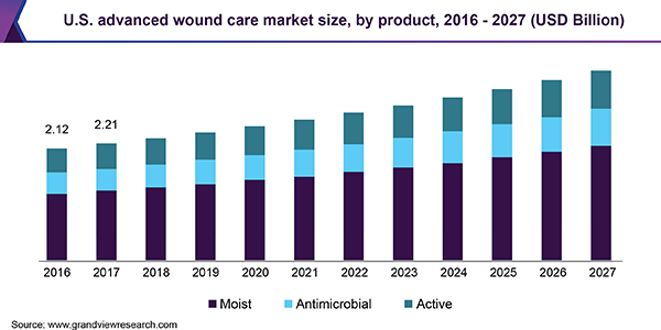 The global advanced wound care market size is expected to reach USD 9.3 billion by 2027, expanding at a CAGR of 5.2% over the forecast period, according to a new report by Grand View Research, Inc. Rising surgical procedures and increasing number of ambulatory surgical centers (ASCs) are some of the key factors driving the market for advanced wound care.