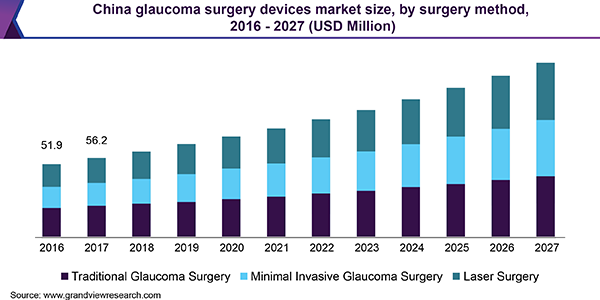 Several initiatives undertaken by the government and NGOs in spreading awareness about glaucoma and its treatment procedures are expected to aid the demand for advanced surgical techniques. Additionally, shift in preference towards advanced minimally invasive surgical options is expected to have a positive impact on the market growth.
