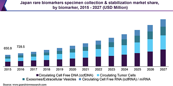 The global rare biomarkers specimen collection and stabilization market size is expected to reach USD 60.7 billion by 2027, expanding at a CAGR of 10.6% over the forecast period, according to a new report by Grand View Research, Inc. Expanding potential applications of circulating rare biomarkers has created lucrative opportunities for the technology developers that are engaged in the introduction of products to support the effective and rapid collection and stabilization of these rare biomarkers specimen. Furthermore, the emergence of liquid biopsy for cancer screening, diagnosis, prognosis, and treatment monitoring has significantly enhanced the competition and capabilities in the market for rare biomarkers specimen collection and stabilization, thereby aiding in revenue growth.