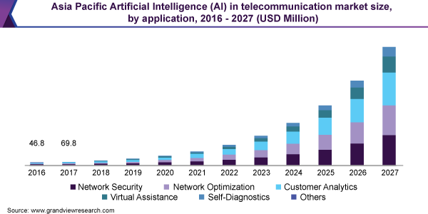 The global artificial intelligence in telecommunication market size is expected to reach USD 9.3 billion by 2027, according to a new report by Grand View Research, Inc. The market is anticipated to register a CAGR of 38.4% from 2020 to 2027.