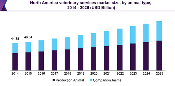 According to a report, “Veterinary Services Market Analysis Report By Animal Type (Production (Poultry, Cattle, Swine), Companion (Cats, Dogs, Equine)), By Region (APAC, North America, Europe), And Segment Forecasts, 2018–2025”, published by Grand View Research, Inc. The global veterinary services market size is expected to reach USD 142.04 billion in 2025, registering a CAGR of 5.6%, as per a new report by Grand View Research Inc. Concerns regarding pet security and well-being have encouraged the adoption of effective veterinary services worldwide. This has also fueled the pet adoption rate and is one of the primary growth stimulants for market growth.