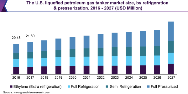 The global LPG tanker market size is expected to reach USD 295.5 million by 2027 registering a CAGR of 6.0%, according to a new report by Grand View Research, Inc. The government policies related to reducing Greenhouse Gas (GHG) emissions, leading to the replacement of coal with clean fuel, will drive the market growth. The demand for natural gas is high in developing countries such as China. Moreover, the growing acceptance of LPG as a feedstock in petrochemical plants will boost market growth over the coming years.