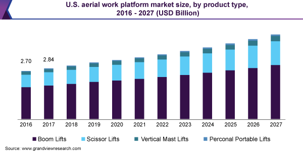 The global aerial work platform market size is anticipated to reach USD 16.76 billion by 2027, according to a new report by Grand View Research, Inc., expanding at a CAGR of 6.0% from 2020 to 2027. Increasing government investment in the private sector, along with rapid infrastructure development in Asia Pacific, is anticipated to surge market growth over the forecast period.