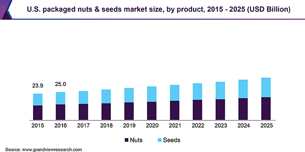 The global packaged nuts & seeds market size is expected to reach USD 83.4 billion by 2025, according to a new report by Grand View Research, Inc., expanding at a CAGR of 5.3% over the forecast period. Shifting customer preference for nutritious food products is boosting the demand for the packaged nuts & seeds.