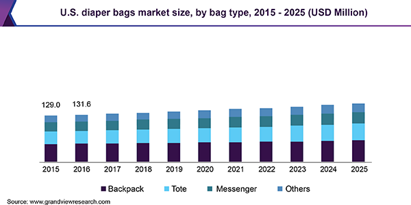 The global diaper bags market size is anticipated to reach USD 797.7 million by 2025, according to a new report by Grand View Research, Inc., expanding at a CAGR of 2.9% over the forecast period. Growing consumer preference for organized utility storage and hassle free travel along with infants and product innovation with respect to trendy designs and loading capacity are some of the factors accelerating the growth of the global market.