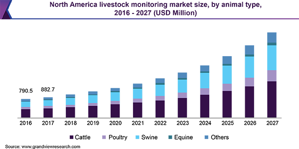 The global livestock monitoring market size is expected to reach USD 11.5 billion by 2027 according to a new report by Grand View Research, Inc. The market is expected to expand at a CAGR of 15.9% from 2020 to 2027. An increase in the population of domesticated animals coupled with the farmer’s focus on increasing yield and productivity is the key contributor to market growth.