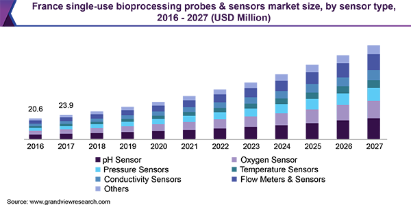 - In terms of sensor type, single-use pH and dissolved oxygen sensors are the most used disposable sensors in the bioprocessing industry. Products for pressure measurement have already become widely accepted and adopted