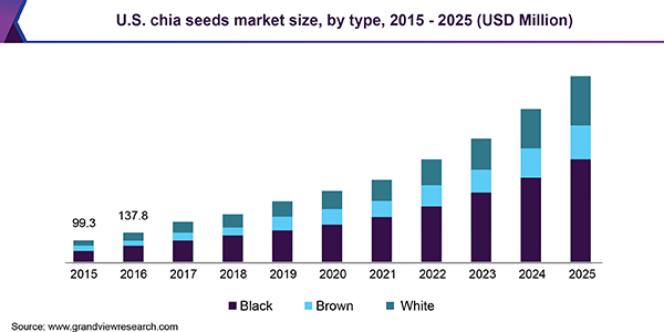 According to a report, “Chia Seeds Market Size, Share & Trends Analysis Report By Form (Oil, Milled/Ground, Whole, Pre-hydrated), By Type (Black, Brown, White), By Region (North America, APAC, Europe, MEA), And Segment Forecasts, 2019–2025”, published by Grand View Research, Inc. The global chia seeds market size is expected to reach USD 4.7 billion by 2025 growing at a CAGR of 22.3%, According to a new report by Grand View Research, Inc. Rising demand for gluten-free products, awareness about the health benefits of chia seeds, and growing use of omega 3 in animal feed are some of the prominent factors driving the growth of this market.