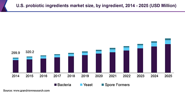 The global probiotic ingredients market size is projected to reach USD 3.56 billion by 2025, according to a new report by Grand View Research, Inc. It is expected to expand at a CAGR of 7.9% over the forecast period. Increasing consumer awareness regarding preventive healthcare has emerged as a key market driver. Probiotics play a great role in preventive healthcare as they prevent the occurrence of a disease by strengthening the immune system of the body.