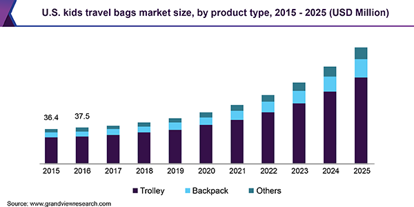 The global kids travel bags market size is expected to reach USD 509.2 million by 2025, according to a new report by Grand View Research, Inc., expanding at a CAGR of 15.5% over the forecast period. The market growth is attributed to growing trend of family trips, educational tours of kids, and inclination towards outbound travels. Shifting preference towards leisure travels with families also acts as a driving factor for increasing penetration of kids traveling bags on account of providing a sense of responsibility as well as fun to carry own luggage.