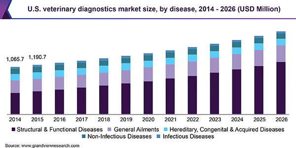 The global veterinary diagnostics market size is expected to reach USD 5.5 billion by 2026, according to a new report by Grand View Research, Inc., exhibiting a CAGR of 6.4%. Growing incidence of zoonotic and foodborne diseases is expected to drive the market over the forecast period. Moreover, increasing companion animal ownership in developing countries is another factor aiding growth.