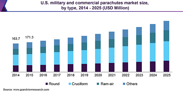 The global military and commercial parachutes market size is expected to reach USD 930.4 million by 2025, growing at a CAGR of 6.1% from 2019 to 2025, according to a new study conducted by Grand View Research, Inc. The increasing expenditure of governments in the defense sector across the world and the growth of adventurers pursuing skydiving/parachuting as a leisure activity are the major driving forces for the growth of the market. Moreover, advancements in the fabric technology amid smart textiles’ evolution and its application in parachute manufacturing is likely to propel the utility of parachutes in military and commercial applications.