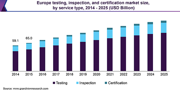 The global testing, inspection, and certification market size is expected to reach USD 404.7 billion by 2025, according to a new report by Grand View Research, Inc. The market is anticipated to witness a CAGR of 5.2% from 2019 to 2025. Testing, inspection, and certification (TIC) services are being adopted rapidly due to the strict implementation of testing, inspection, and certification regulations. The market incumbents cater to various range of industries and sectors across the globe with a variety of legislation and standards.