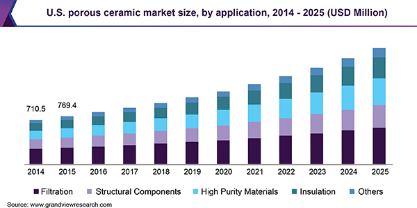 The global porous ceramics market size is expected to reach USD 12.4 billion by 2025, growing at a CAGR of 11.4%, according to a new report by Grand View Research, Inc. Expansion of the medical industry across the globe coupled with the use of advanced devices and tools is projected to propel the market growth.