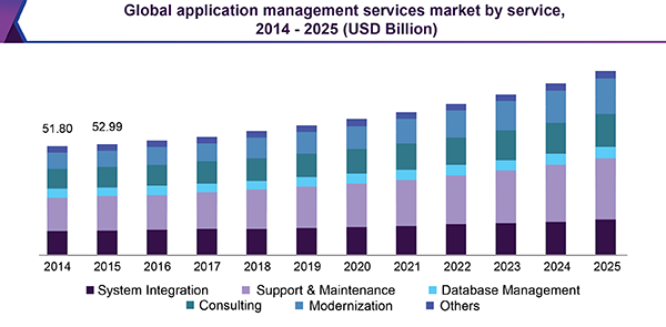 The global application management services market size is estimated to reach USD 87.60 billion by 2025, according to a new report by Grand View Research, Inc. The industry is expected to witness a steady growth owing to the increasing demand from the financial services sector and healthcare industry.