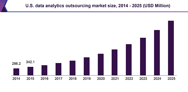 The global data analytics outsourcing market is expected to reach USD 10,321.6 million by 2025, according to a new study conducted by Grand View Research, Inc. The growing need for outsourcing service among organizations to manage growing customer’s data is expected to drive the growth of the market over the forecast period.