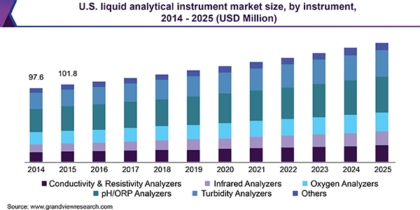 The global liquid analytical instrument market size is expected to reach USD 606.2 million by 2025, according to a new study conducted by Grand View Research, Inc., registering a 5.5% CAGR during the forecast period. Increasing demand for liquid analytical instruments in food and beverage processing units for control and measurement of chemical composition of fluids is expected to drive the market.