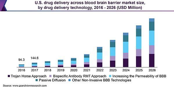 The global drug delivery across blood brain barrier market size is expected to reach USD 4.6 billion by 2026, according to a new report by Grand View Research, Inc. registering a CAGR of 30.2% over the forecast period. Growing research, innovation, and treatment development activities to overcome the challenges faced due to the natural blood brain barrier is majorly driving the market growth.