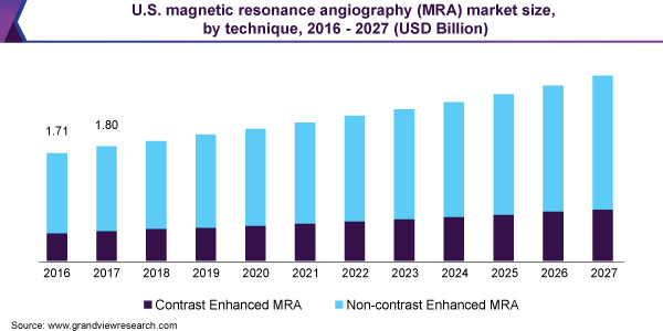 - The abdominal MRAs segment is expected to register a maximum CAGR from 2020 to 2027. Abdominal MRAs assist in the assessment and diagnosis of various vascular abnormalities and are performed for the examination of the lymph nodes, blood vessels, blood flow, and to investigate the cause of swelling or pain
