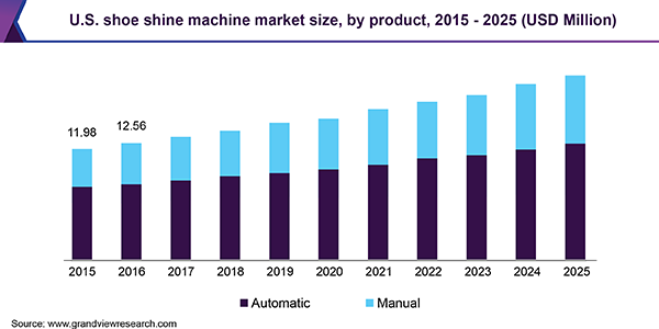 The global shoe shine machine market size is expected to reach USD 72.8 million by 2025 registering a CAGR of 5.95%, according to a new report by Grand View Research, Inc. Rising number of working individuals along with increasing demand for quick shoe cleaning services is projected to drive the demand for shoe polishing machines. In addition, the advent of innovative compact, portable, and automated products with dual cleaning brushes and sensors will dive the demand further. Hands-free operation of these machines is also boosting their demand.