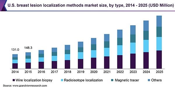 The global breast lesion localization methods market size is expected to reach USD 1.58 billion by 2025, according to a new report by Grand View Research, Inc. It is projected to witness a CAGR of 13.3% during the forecast period. Growing number of government and non-government reimbursement policies for the breast cancer diagnostics, biopsy, examination, and other medical procedures are estimated to increase the adoption of breast lesion localization methods. Moreover, high demand for better healthcare infrastructure and facilities due to rising prevalence of the target disease among women is expected to fuel the market growth.