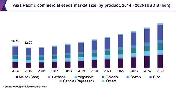 The global commercial seed market size is anticipated to reach USD 92.32 billion by 2025, according to a new report by Grand View Research, Inc. It is anticipated to register a CAGR of 8.1% over the forecast period. The increasing demand for food owing to rising global population is a significant factor driving the market. Moreover, the high yield and cost-effectiveness offered by Genetically Modified (GM) seeds are predicted to propel the product demand.