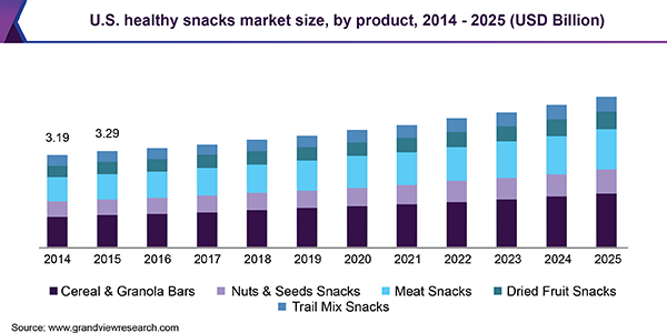 The global healthy snacks market size is expected to reach USD 32.88 billion by 2025, according to a new report by Grand View Research, Inc., expanding at a CAGR of 5.2% during the forecast period. Increasing awareness regarding health and wellness benefits offered by the product among consumers is likely to be a key trend driving the market.