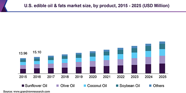 The global edible oil and fats market size is expected to reach USD 162.51 billion by 2025, according to a new report by Grand View Research, Inc. Rising popularity of edible oil as a key nutritional constituent on account of its various benefits including improvement in immune system and prevention from cardiovascular disorders is projected to drive the demand.