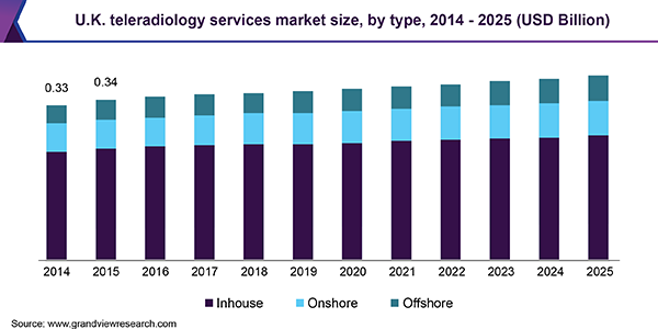 The global teleradiology services market size is expected to reach USD 25.9 billion by 2025, registering a CAGR of 2.3% over the forecast period, according to a new report published by Grand View Research, Inc. Shortage of radiologists in several countries has increased the adoption of teleradiology services in recent years. According to the 2017 workforce report by the Royal College of Radiologists (RCR), U.K., the National Health Service (NHS) spent USD 150 Million for outsourcing patient radiology scans due to shortage of radiologists. Moreover, several factors, such as need for after working hour coverage, lower reporting cost, and short Turn-Around-Time (TAT) have led to an increase in outsourcing of teleradiology services.