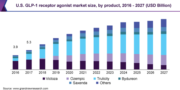 The global GLP-1 receptor agonist market size is expected to reach USD 18.2 billion by 2027, expanding at a CAGR of 6.1%, according to a new report by Grand View Research, Inc. The strong product pipeline and formulation advancements are driving the market. In addition, novel innovative products are booming the market. In September 2019, Rybelsus, the first and only oral GLP-1 analog was approved by the U.S.FDA for improving the glycemic control in type-2 diabetes patients. It is a semaglutide-based product developed by Novo Nordisk, which is currently under review by European Medicines Agency (EMA) and Pharmaceuticals and Medical Devices Agency (PMDA). After receiving the approval, the market may witness significant growth over the forecast period.
