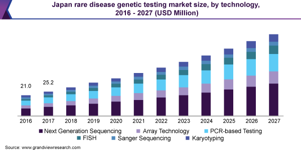 The global rare disease genetic testing market size is expected to reach USD 1.8 billion by 2027 expanding at a CAGR of 10.8% over the forecast period, according to a new report by Grand View Research, Inc. Conventional test methods provide delayed diagnosis. Moreover, patients need to visit physicians to correctly identify a rare condition, leading to an increased healthcare spending. This has spurred the adoption of genetic test methods for accurate and timely identification of rare conditions.